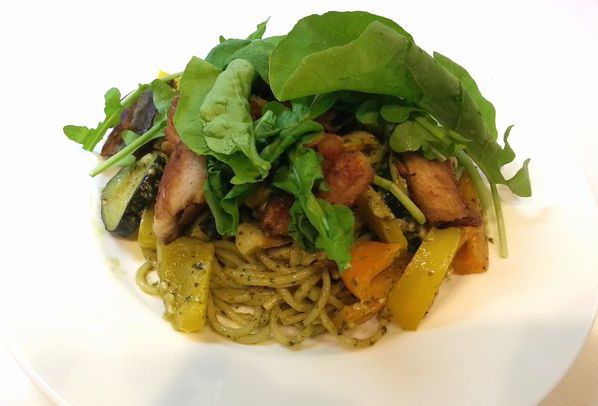 3.スパゲティを規定の時間茹で、パプリカ、エリンギを幅1cm、長さ5cmくらいに切りそろえ、フライパンにオリーブオイルとにんにく、パプリカとエリンギ入れ炒め、ジェノベーゼソースを入れ、茹でたパスタを和える